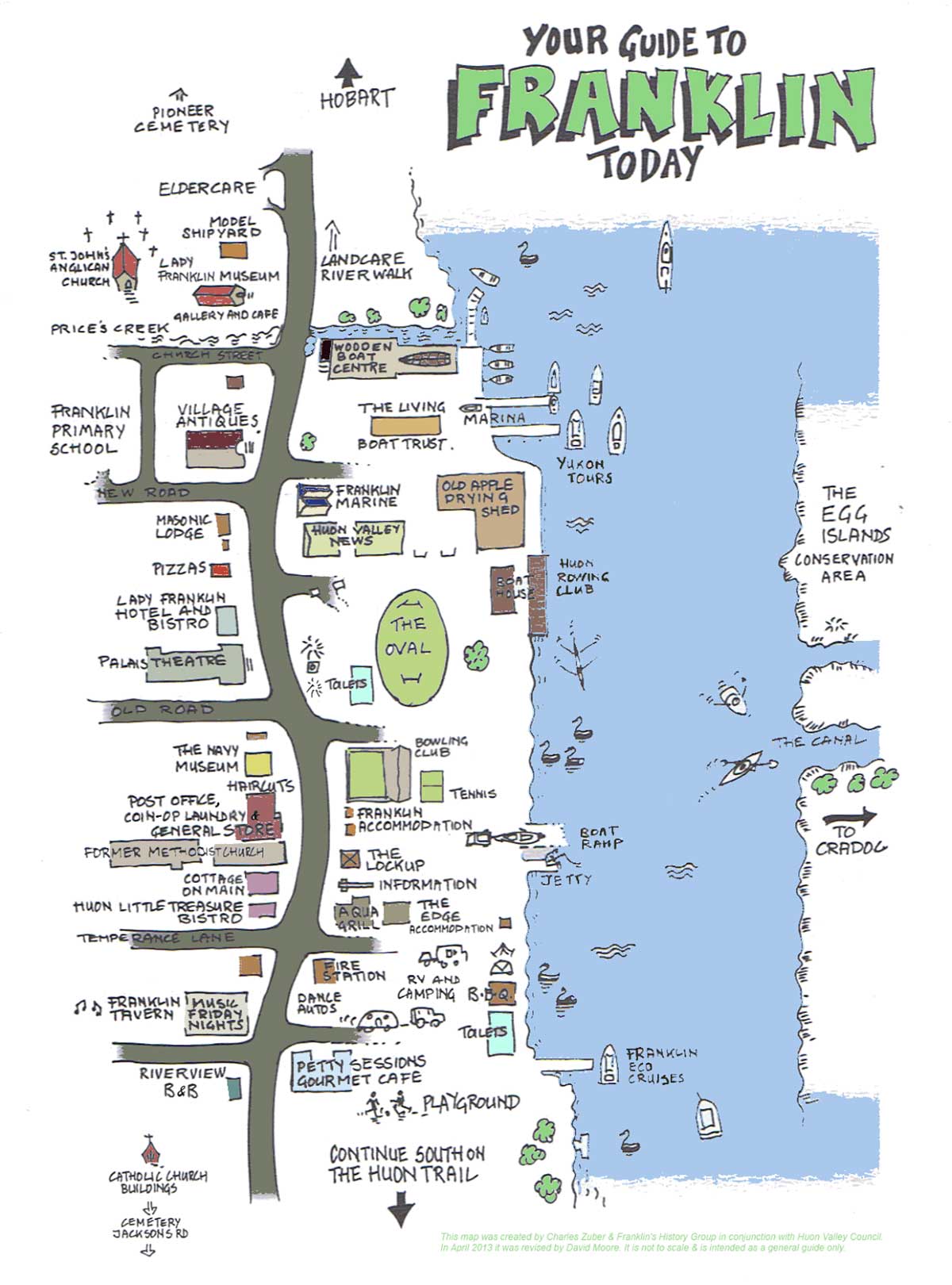 Ye Olde Franklin Tavern is a pleasant historic pub beside the road which proudly announces that it was established in 1853 and the jetty beside the river which was once used as a major point for shipping timber and fruit from the area. In the river at Franklin is the long narrow strip of land known as Egg Island.