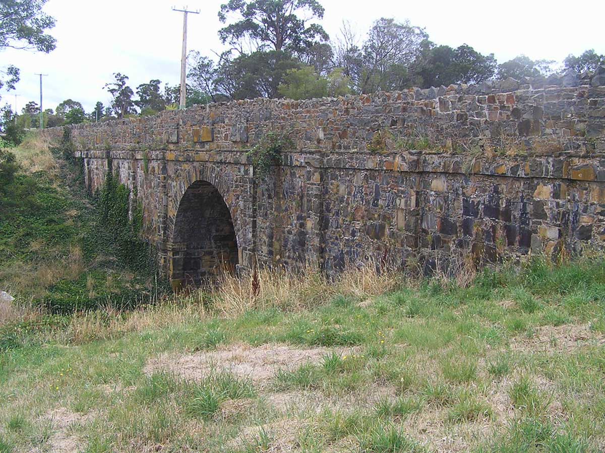 Strathroy Bridge is a fine stone bridge built by convict labour in 1836 as one of the earliest major bridge on the Midlands Highway. The bridge is still in operation today. It is a fieldstone bridge laid to courses, featuring a central arch. pilasters, a string course, projecting panels and spiky rocks on its balustrade. Location: Hobart Road (former Midland Highway), over Jinglers Creek, 1km south of Franklin Village.