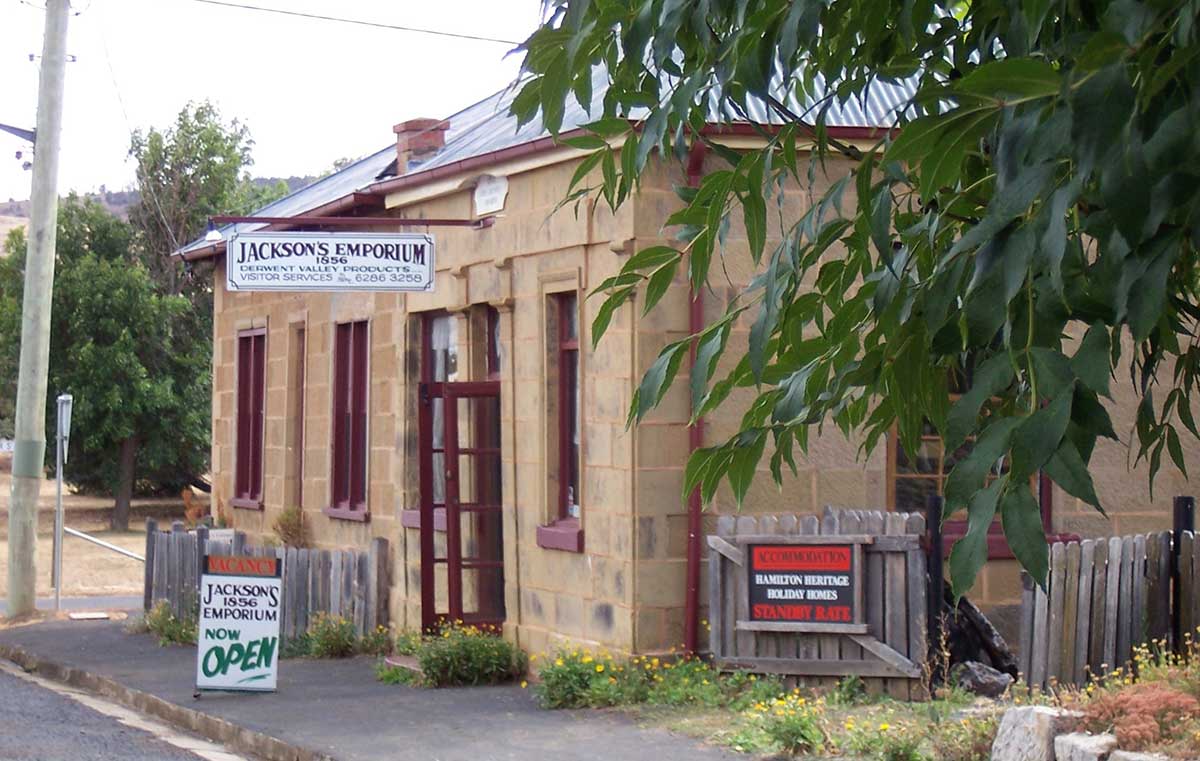 Jackson's Emporium: Built by James Jackson in 1845, this building was originally 2 storeys but it was damaged by fire in the 1930's and was reduced to a single storey. This building was the centre of commerce in colonial Hamilton from the1860's to 1880's. Today it relives that history once again. The Emporium specialises in locally made Derwent Valle products - fuit nd berries, jams and preserves, cheese and smallgoods, wines and beverages, essential loils and local crafts. Jackson’s Emporium can cater for your heritage accommodation, as well as hearty home-style cooking - with a twist, through the day and evening.