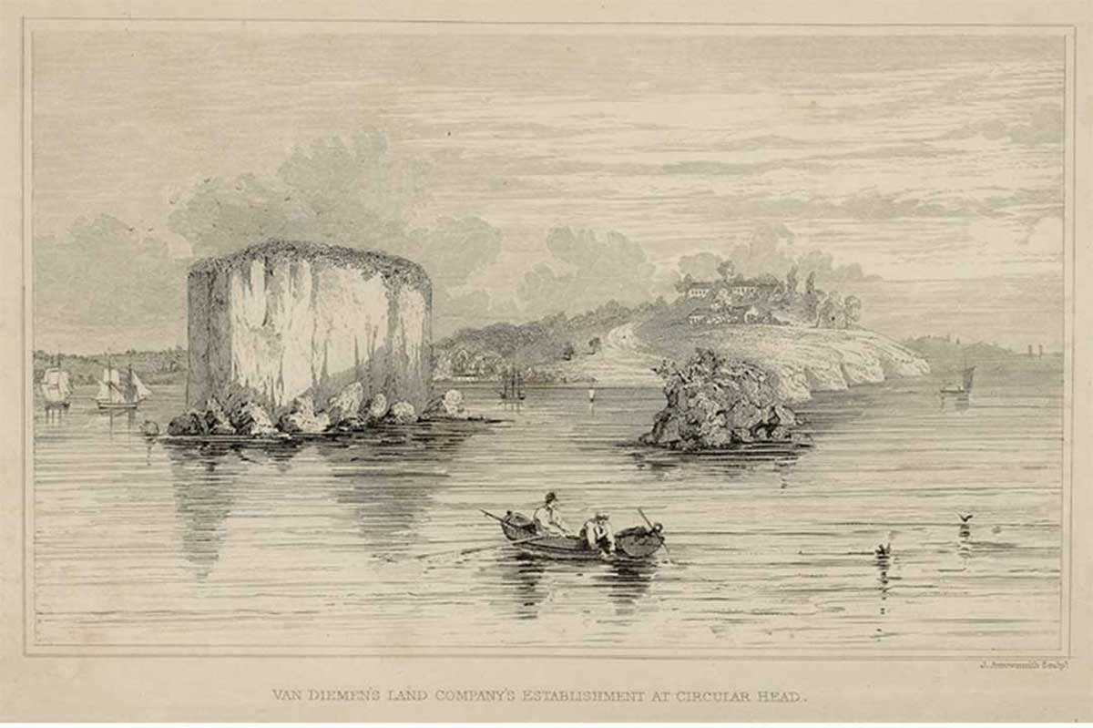 Above: illustration of the Van Diemen's Land Company's Circular Head settlement, 1832. Circular Head is depicted as being offshore away from the mainland settlement.