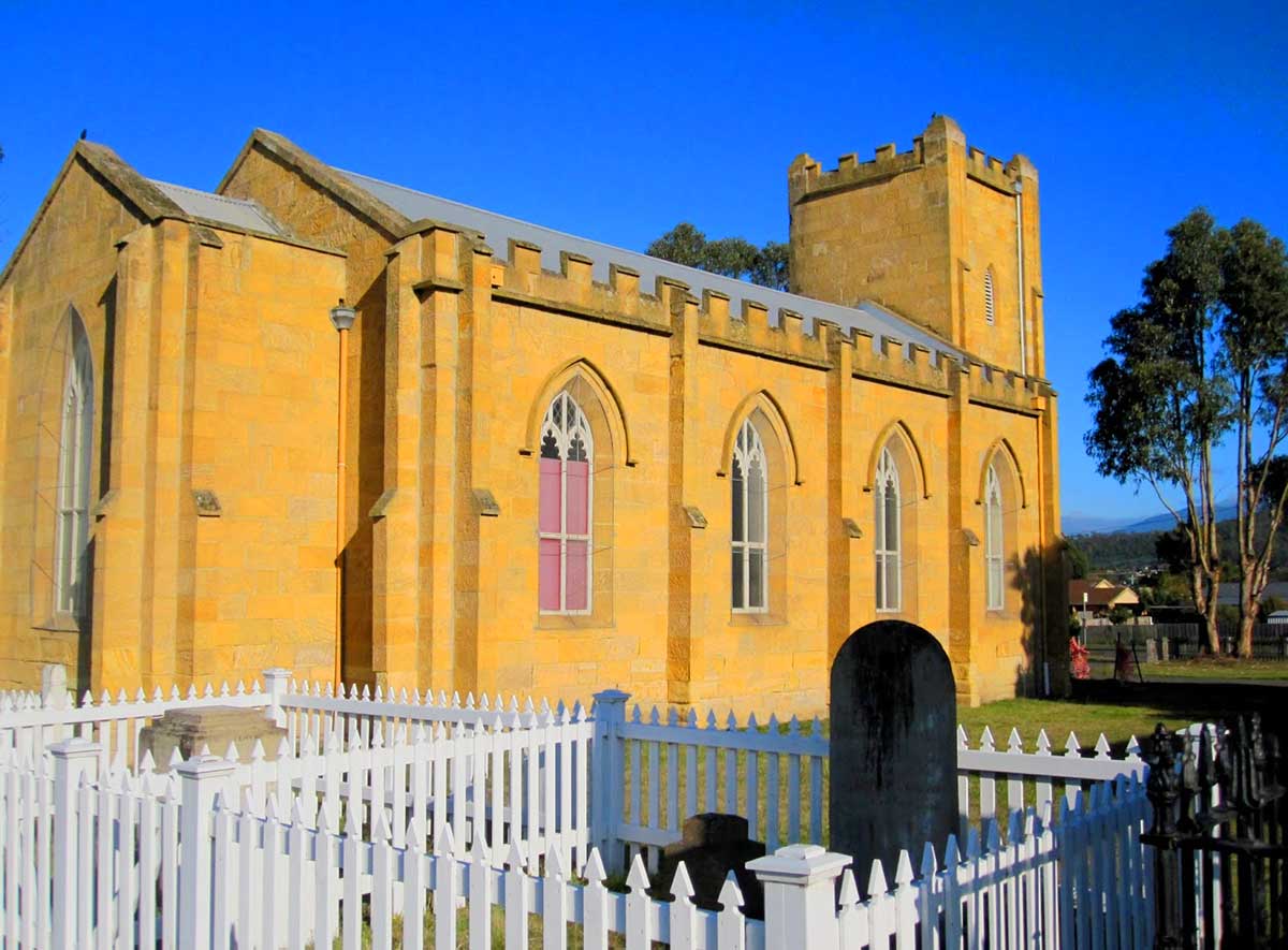Rokeby has a traditional British picket-fences cricket ground and an historic church. St Matthews Church, in Mockridge Road, was completed in 1843 and contains the grave of Van Diemen's Land's first Church of England chaplain. Rokeby's first service was held in 1821 by the Reverend Robert (known as Bobby) Knopwood who was the first Church of England chaplain in Van Diemans Land. The church was designed by convict architect James Blackburn and was dedicated by Bishop Francis Russell Nixon in September 1843. Inside are some chairs which were carved from wood used in the ships in Nelson's fleet. The church and the graveyard are located in King Street just off Mockridge Road.