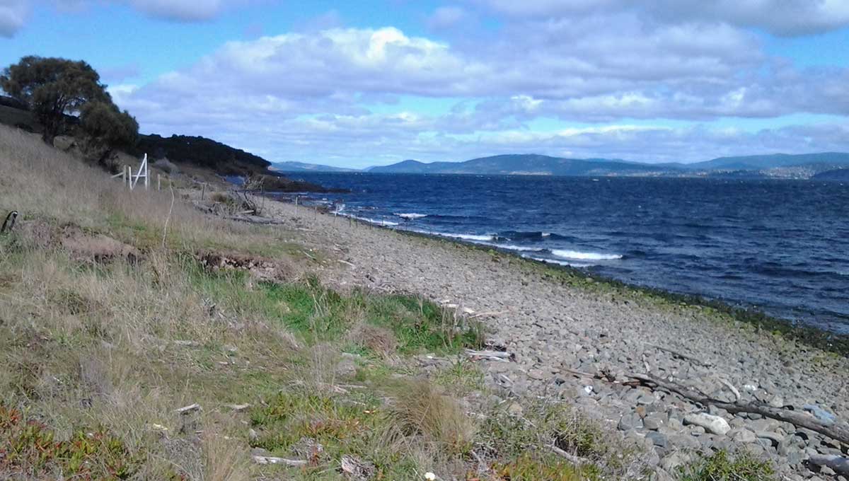Rokeby Beach is located in the northwestern corner of Ralphs Bay. It is bordered to the east by the low Mill Point which is backed by the police academy, with Clarence Creek draining out across the western end of the beach below the rising slopes of the 100 m high Rokeby Hills. The beach continues for 200 m south of the creek mouth with tidal shoals extending off the mouth. The Clarence Road crosses the creek at the western end of the beach, where a boat ramp is located.