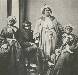 A group of Tasmanian Aborigines at Oyster Cove, Hobart, in the 1860s. Trugernanner is seated at the far right.