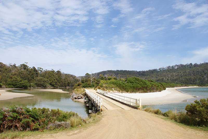 Cross over Catamaran River and Cockle Creek Road continues through the tiny settlement of Cataman to Cockle Creek. After passing Bruni D'Entrecasteaux's watering place historic site the road crosses Cockle Creek, then loops around a small bay and stops at Bottoms Green Campsite. This is the set-off point for the South Coast Walking Track and the southern tip of Australia. A sign announces that you have reached "The End of The Road" - you are now standing in Australia's most southern street and there is no further point south of here in Australia that can be reached by road. Visitors to Cockle Creek must return to Hobart by the way they came - along Cockle Creek Road and Huon Hwy via Geeveston and Huonville.