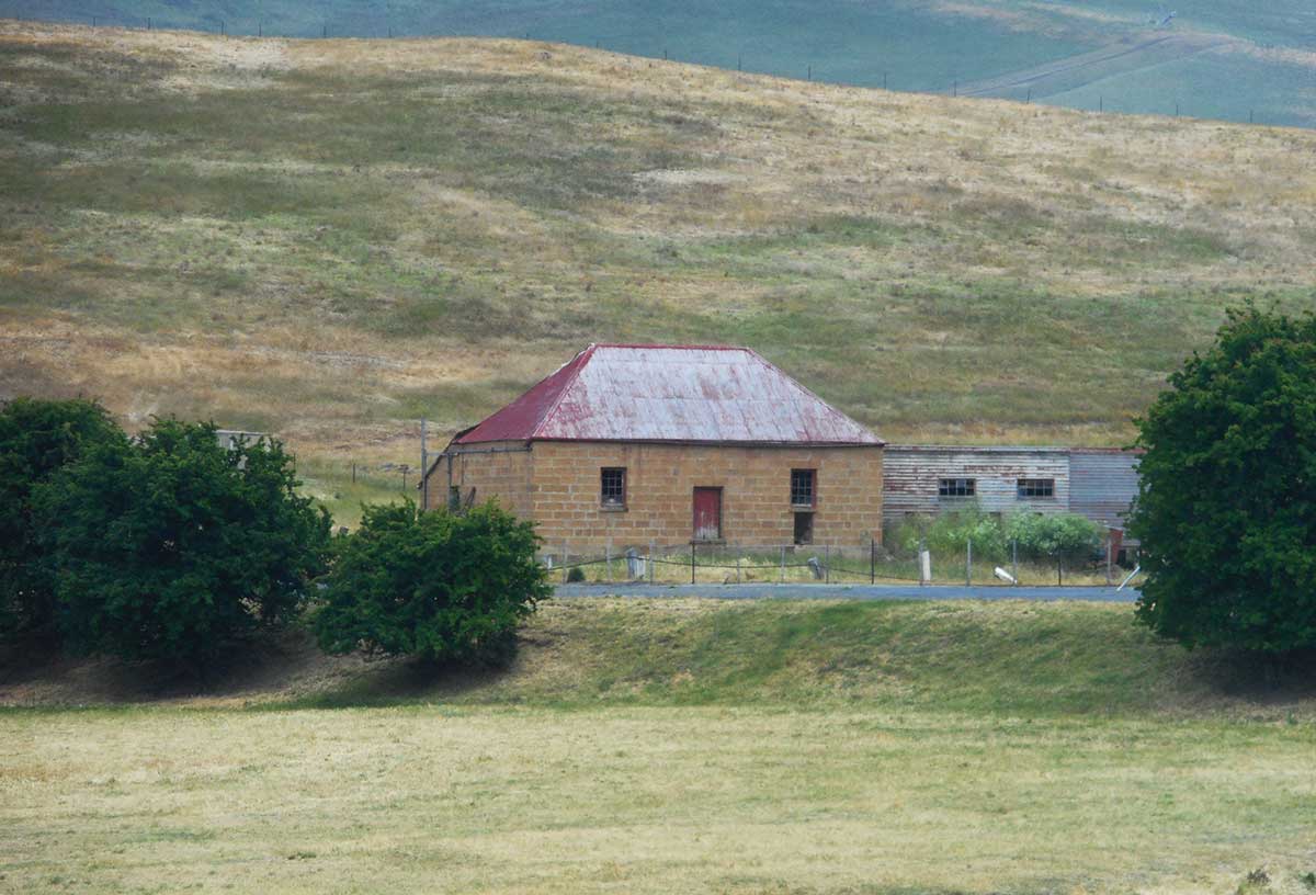 John Bisdee and his family settled and built Hutton Park, near Melton Mowbray in the 1820s. They arrived as gentry and were given the land and doubtless convicts enough to build them the stone house that survives. Bisdee talked four brothers into migrating and between them they owned a large hunk of the district by 1840. Bisdees, classed among the 'better element' of the colony, did his best to transplant English county life into the Van Diemen's Land midlands. Once they had cleared out the bothersome Aborigines and enough forest, they introduced deer and rode to hounds - the outings of the Hutton Park Beagles made regular appearances in the papers. Apart from a group of sheltering trees around the homestead the landscape is bare for some distance these days.