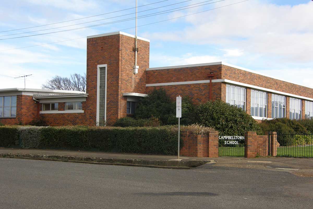 Campbell Town has a number of Art Deco buildings, erected during the inter-war years when Campbell Town enjoyed a growth spurt. Campbell Town State School was built between September 1937 and June 1938. It was designed by S W T Blythe of the Public Works Department assisted by J H Walter. A tower at the corner is its dominant feature. The tall glass brick panel in the tower will offers a pleasing contrast to the marked horizontality of the class and cloak rooms.