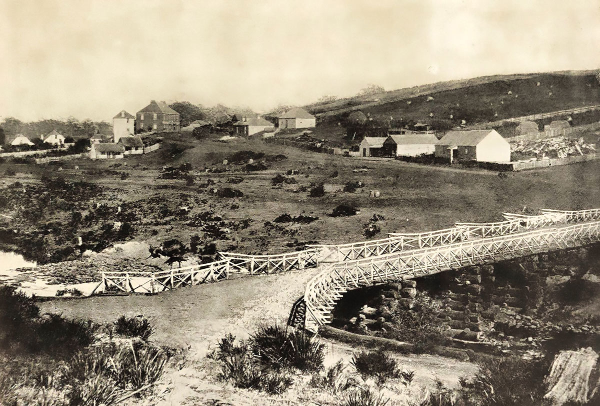 The newly built road bridge and St Mark's Anglican Church prior to its chancel and sanctuary being added in 1878