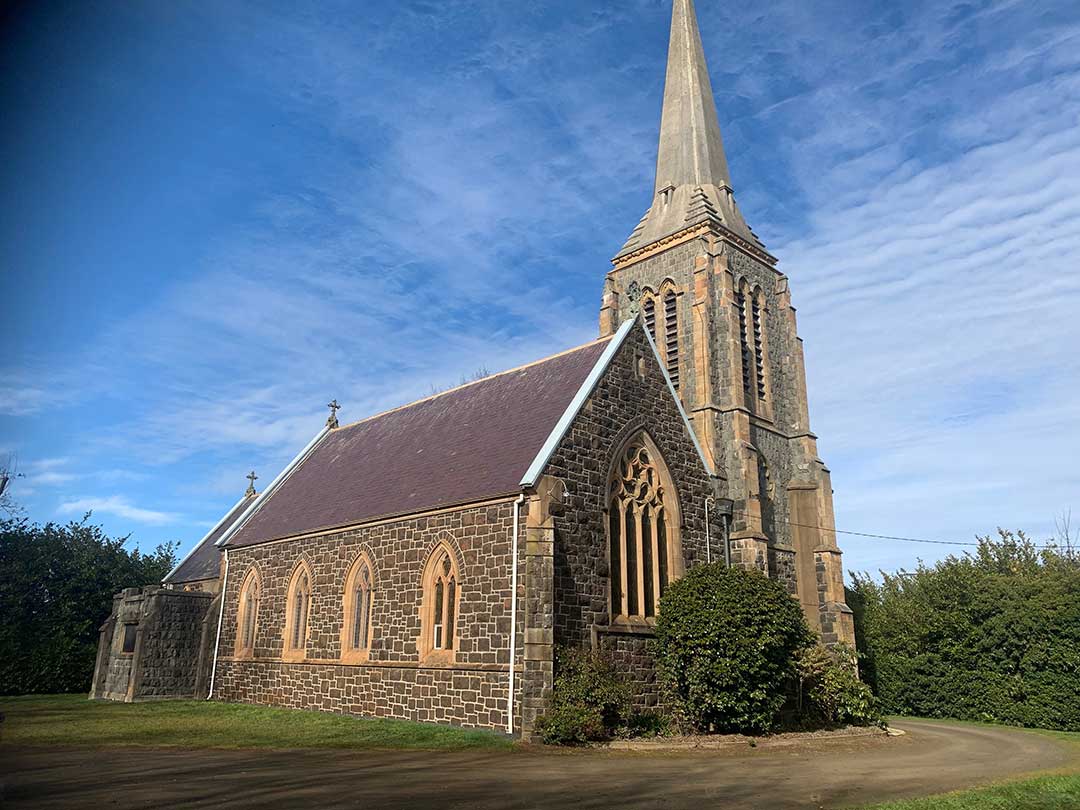 The Church of England's parish of Hagley had its beginnings in 1856 when Dry endowed it with three farms. Between them these farms brought in 400 pounds rental income per year. While in England, on a trip taken for his health, Dry commissioned architect Richard Cromwell Carpenter to draw plans for a new church. The plans were modified by Carpenter's agent in Hobart, Henry Hunter. On returning to Tasmania, Dry donated 13 acres (5.3 ha) of land for the church. Hunter was also responsible for designing churches at Westbury, Deloraine, Colebrook, Tasmania and the Church of the Apostles in Launceston. Dry funded construction of the rectory and funded a significant part of the church's construction. Some other funding came from the sale of the original church and land. As first built it only had a nave and aisle.