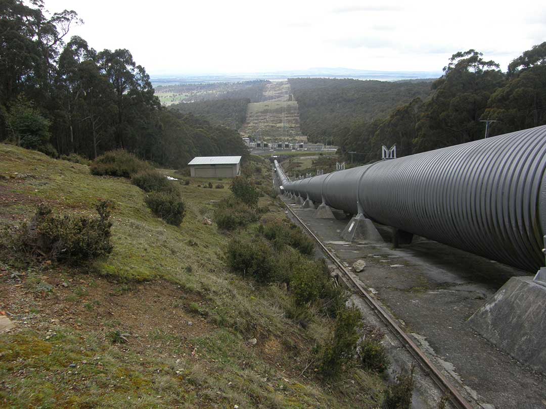 Poatina hydro-electric power station, some 3.5 km from the town, has six turbines, with a combined generating capacity of 300 MW of electricity. It makes use of a 900 metre drop from the Great Western Tiers to the Norfolk Plains; water from Great Lake is diverted via a tunnel to the edge of the Tiers where it plummets down a viable penstock line, which enters the ground again near the power station. The Poatina Power Station is located in a massive artificial underground cavern, hence the name Poatina, Palawa for cavern or cave.