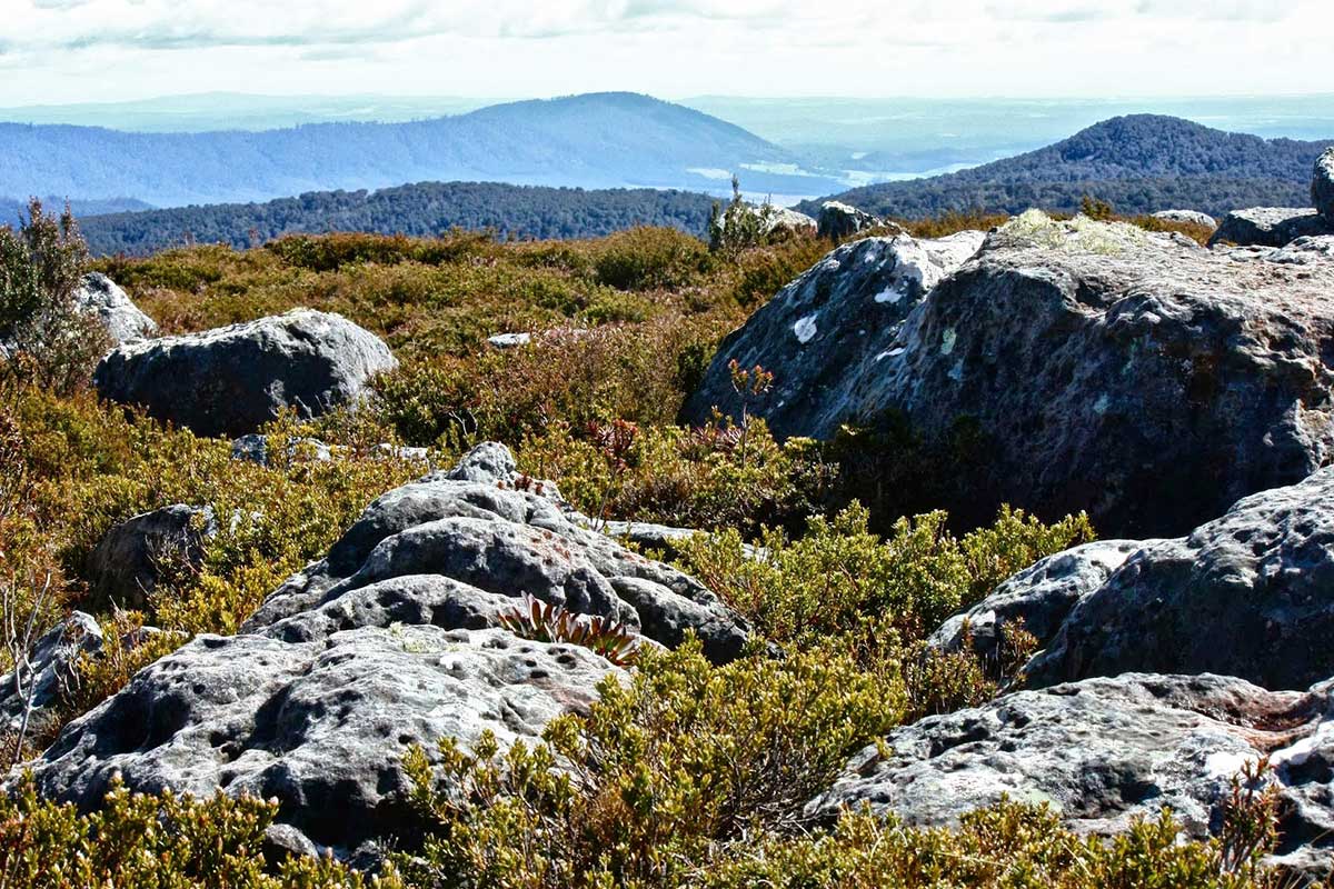Cratered granite dykes scatter a section of the summit, if climbed in spring the mountain is is ablaze with some much scoparia on top it looks like an enormous giant's garden. The waratah on the lower slopes are also very impressive. Access from Buckneys Road, off Tasman Highway.