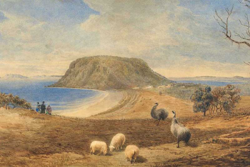 A watercolour by William Porden Kay depicts emus at Stanley during the 1840s. (Allport Library and Museum of Fine Arts, State Library of Tasmania)
