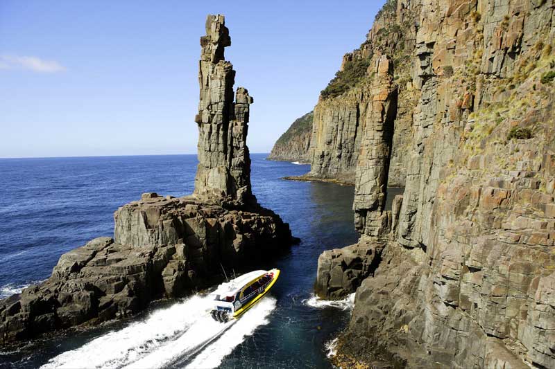 Tasman Island stands defiantly beyond the tip of Cape Pillar, a rugged, desolate and windswept rock; it was named after Dutch seaman Abel Tasman who cautiously skirted its thunderous shores in 1642. Like a fortress, its grey basalt columns rise 240 metres straight out of the sea. Above is a plateau of only 50 hectares, pock-marked with sink holes, caves and small clumps of windswept vegetation.