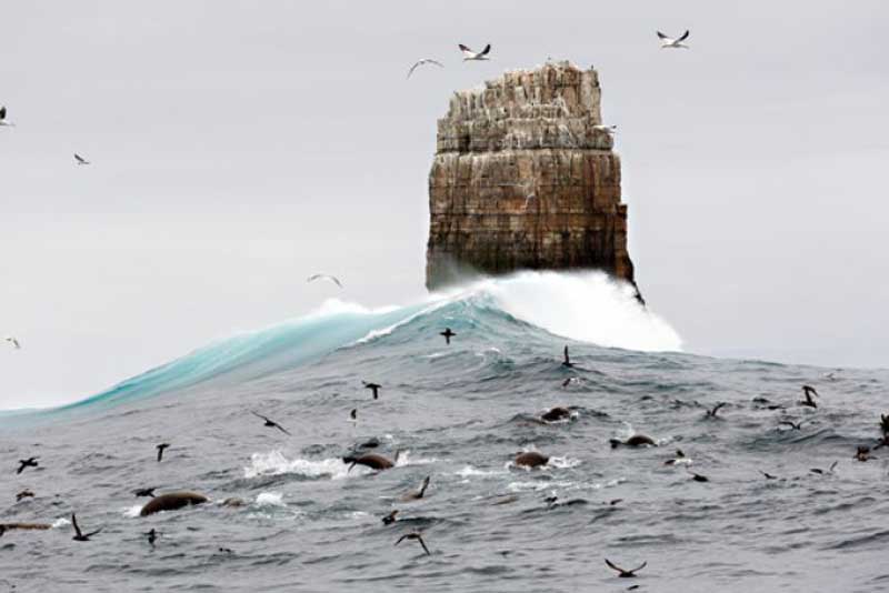 Pedra Branca is a 2.5 ha rock or small island about 26 km south-south-east of South East Cape, Tasmania. It is known for its inaccessibility, rich marine wildlife, wet and windy weather, interesting geology and large waves. It is part of the Southwest National Park, and thus in the Tasmanian Wilderness World Heritage Site. An erosional remnant of the Tasmanian mainland, Pedra Branca is approximately 270 metres long, 100 metres wide, and 60 metres high. This is small enough to provide an example of an outcrop that lies on the border between being a rock or islet and an island.