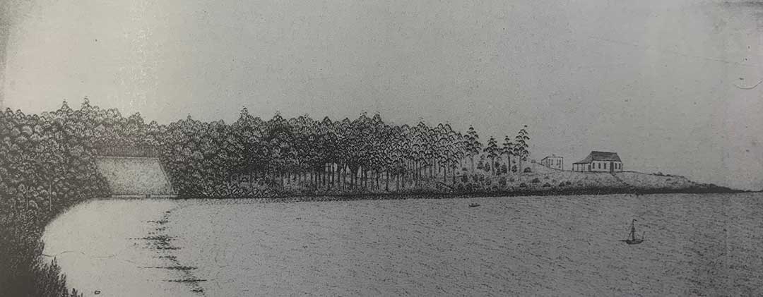 A sketch of Emu Bay by the VDL Co.'s surgeon, Dr John Hutchinson, in 1828, soon after the first buildings had been erected.