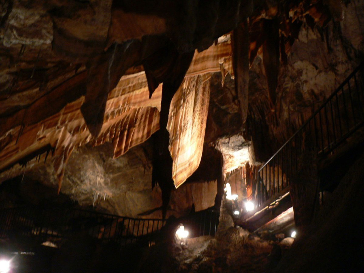 Interpretive guided tours of the cave are run daily at 10am, 11am, 12pm, 1.30pm, 2.30pm and 3.30pm. Upon entry a steep flight of 54 concrete steps are descended and from this point the pathway is fairly level apart from a short ladder to be climbed down. The tour route through the caves is 275 metres long. Because candlelight and torchlight were troublesome, power and fixture lighting was installed throughout to illuminate the walking track and the cave's unique features.