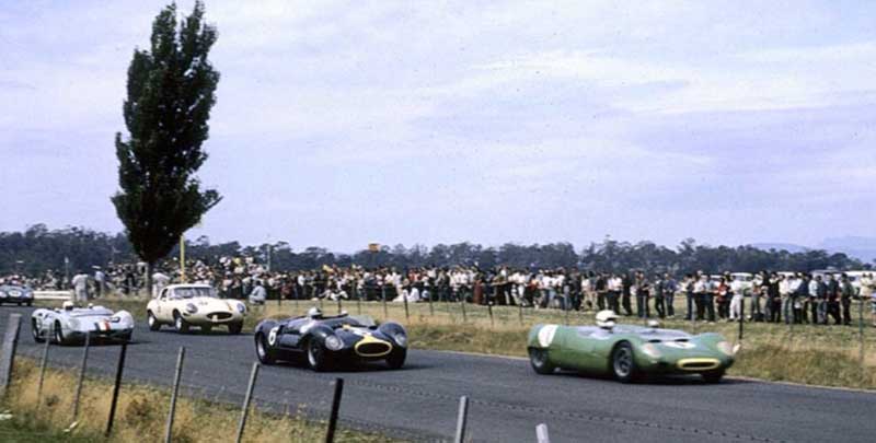 The start of the Australian Tourist Trophy for sportscars, 1964: Pit Straight with Frank Gardner's Alec Mildren owned Lotus 23 Ford leading from Bib Stillwell's Cooper Monaco, Frank Matich in the Total owned Lotus 19B Climax and Bob Jane's Jaguar E-type.