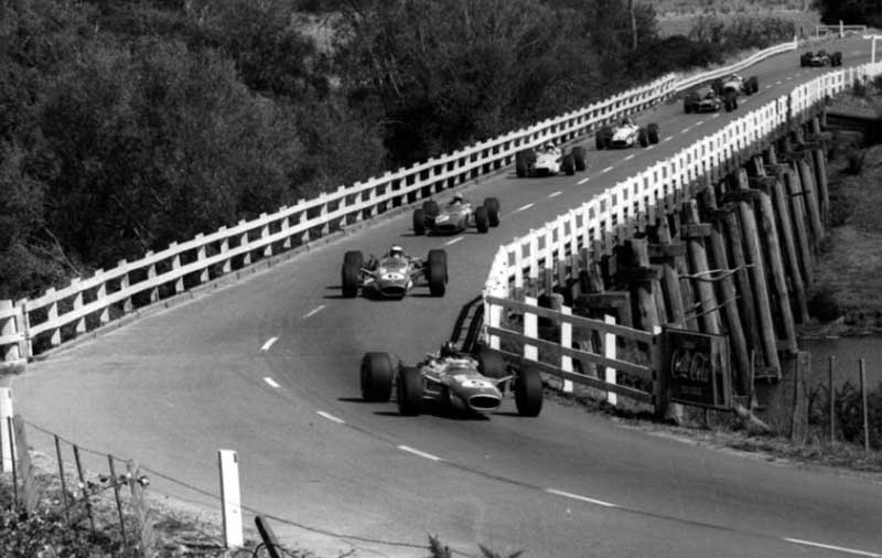 But what really put Longford on the map was the arrival of the international names, starting with World Champion Jack Brabham, winner in 1960. Others followed, including a flu-ridden Roy Salvadori in '61 (he won the main event after Brabham retired), John Surtees in '62, and Bruce McLaren, Chris Amon and Tony Maggs in '63. The launch of the Tasman Series in '64 further strengthened Longford's place, and for five glorious years it held a special role as the final round. Australian open wheel and touring car stars Bib Stillwell, Lex Davison, Leo Geoghegan, Frank Matich, Frank Gardner, Spencer Martin, Kevin Bartlett, John Harvey, Ian Geoghegan, Norm Beechey, Bob Jane and Allan Moffat alll raced at the circuit.