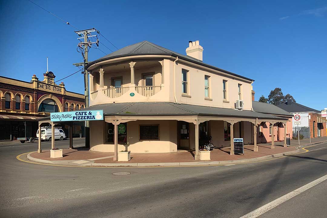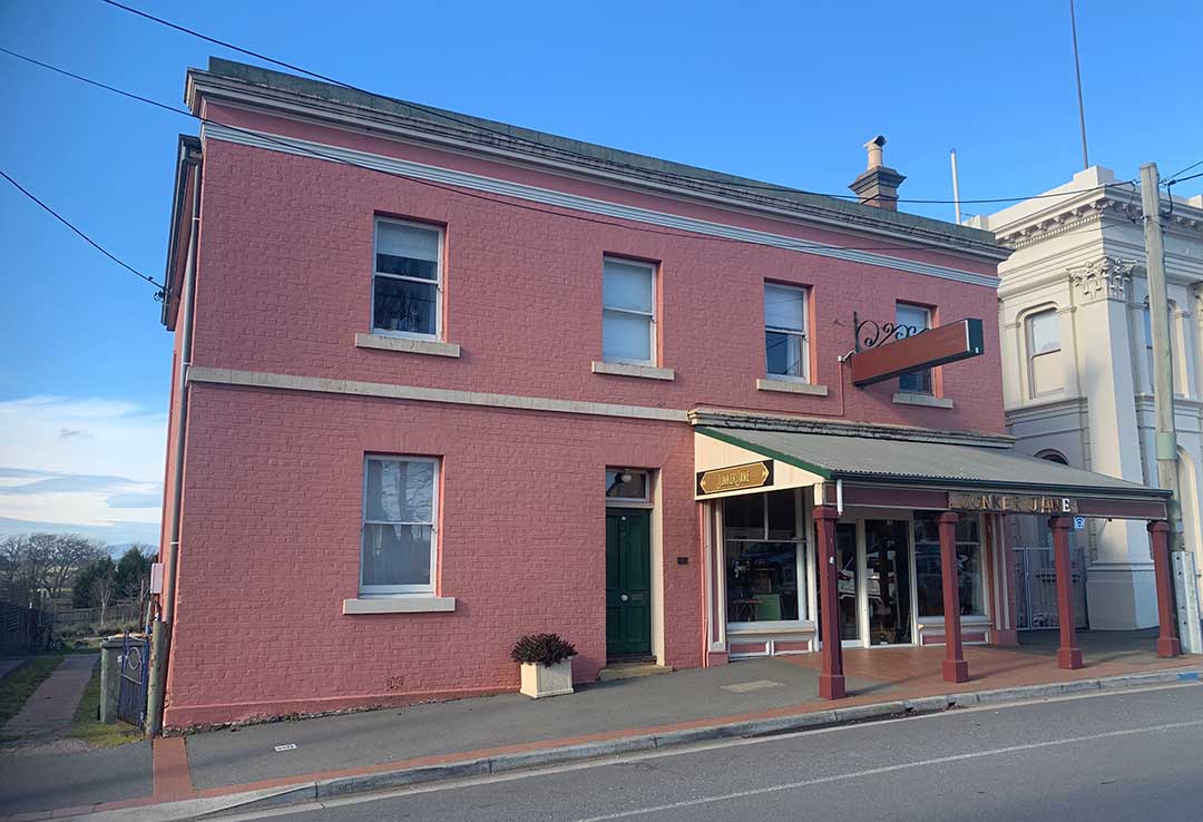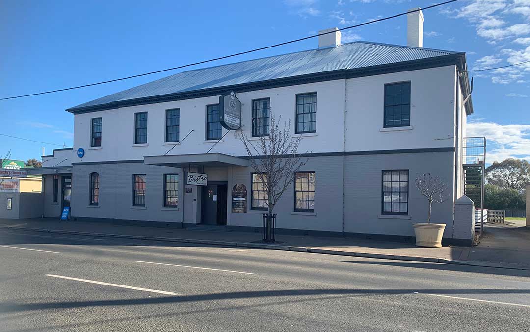 The Country Club Hotel, 19 Wellington Street, was constructed c. 1850. This large two storey painted brick hotel has a splayed corner with simple facade decorated by a stringcourse, brick lintel windowsills to the 12-pane windows, and a dentil course under the projecting eaves. Back in the days when motor racing was held on the streets of longford, th closest the racing circuit got to the town of Longford was the corner of Wellington and Union Streets - known as Pub Corner - that pub being the Country Club Hotel. The cars came along Union Street and turned right into Wellington Street, around the front of the Hotel. Being right on the racing circuit, the hotel was a popular drinking place among spectators. Today the hotel keeps alive its link with Australian motor racing history with memorabilia and photographs on its walls of races held here and the names of the legends of motor sport who raced here. You can enjoy a meal at the Chequered Flag Bistro.