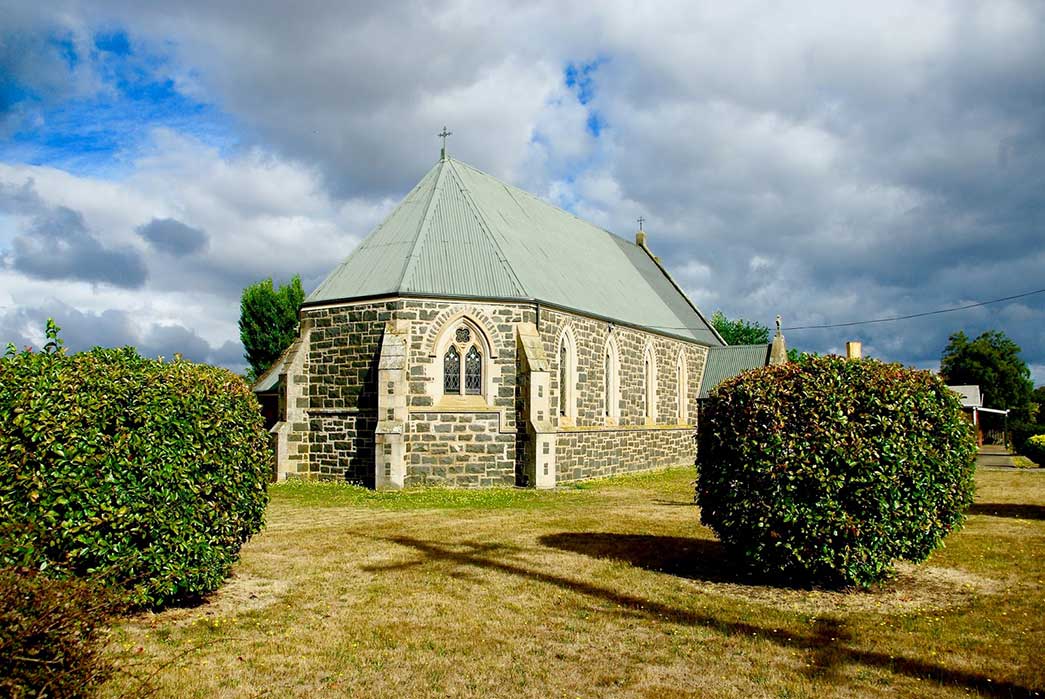 St Augustine's Roman Catholic Church, 24 Goderich St, Longford: In Longford's early days, the Catholics were a poor and marginalised community, comprising mainly of Irish immigrants. The government repeatedly refused to grant land for a Catholic church, however, by the 1850's the Bishop at last made headway and received a 3 acre grant. The foundation stone for the first Catholic Church in Longford was finally laid on the 6 June 1866. Built of bluestone by Father John Butler, the church took a few years to complete due to the lack of funds. Father John McKernan, who came in 1873, added the organ and choir loft. Father McKernan served as priest at St Augustine for 31 years. He is honoured with the only memorial gravestone within the churchyard. The bell and befry were added in 1897.