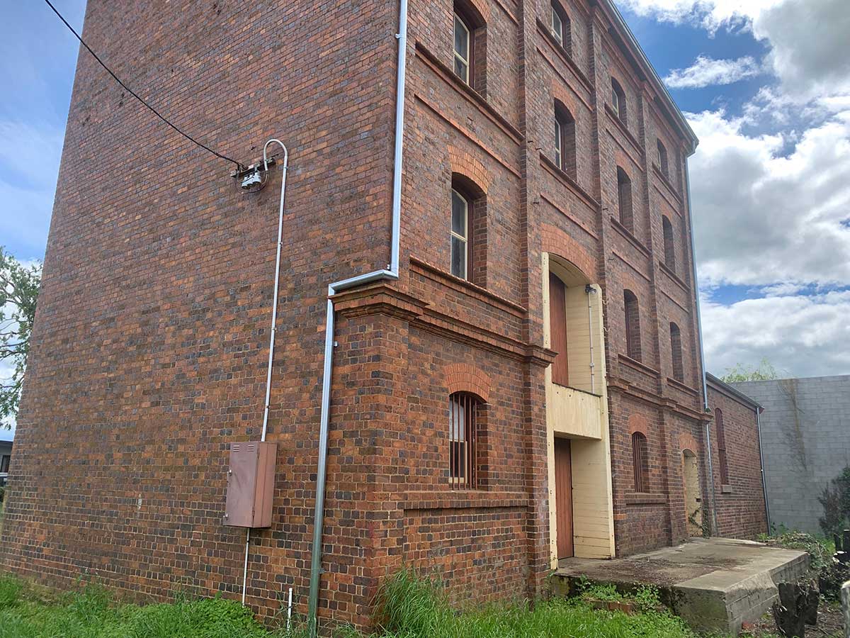 Thomas Affleck's Mill in Union Street is a four-storey brick building, still in use as a produce store. Front and back facades each have 16 windows - four on each level - all of four panes, with slightly arched tops and brick lintels. The main facade is divided into four bays by brick pilasters with brick cornices at each floor level.