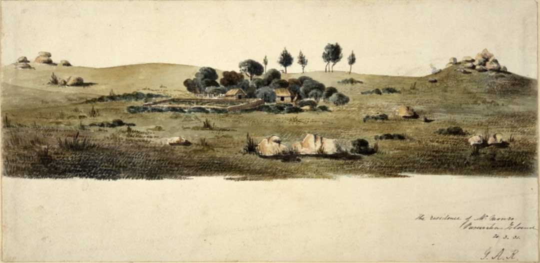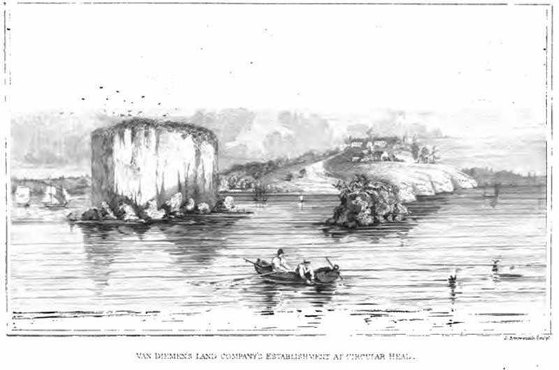 Above: illustration of the Circular Head settlement, 1832. Circular Head is depicted as being offshore away from the mainland settlement.