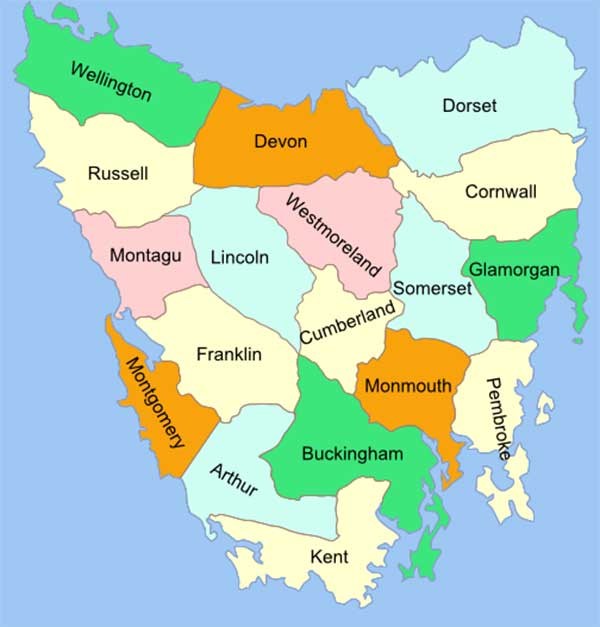 The areas of Tasmania covered by this website roughly equate to the counties of Devon, Wellington and Russell.