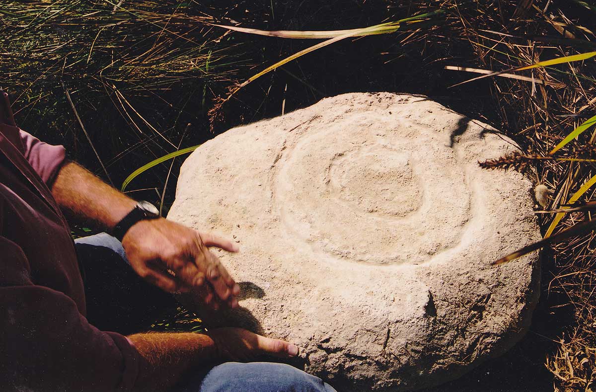 The main site, a few metres to its north, was partially excavated in 1969 to ascertain the total extent of the site. The slab of rock illustrated on this page is part of this group and is covered almost entirely with motifs. Other slabs nearby are extensively carved, they resemble sculptured pieces. The motifs consists of a variety of geometric shapes, including circles, rows of dots, parallel lines and crosses. One rock nearby depicts the tracks of a large bird such as an emu.