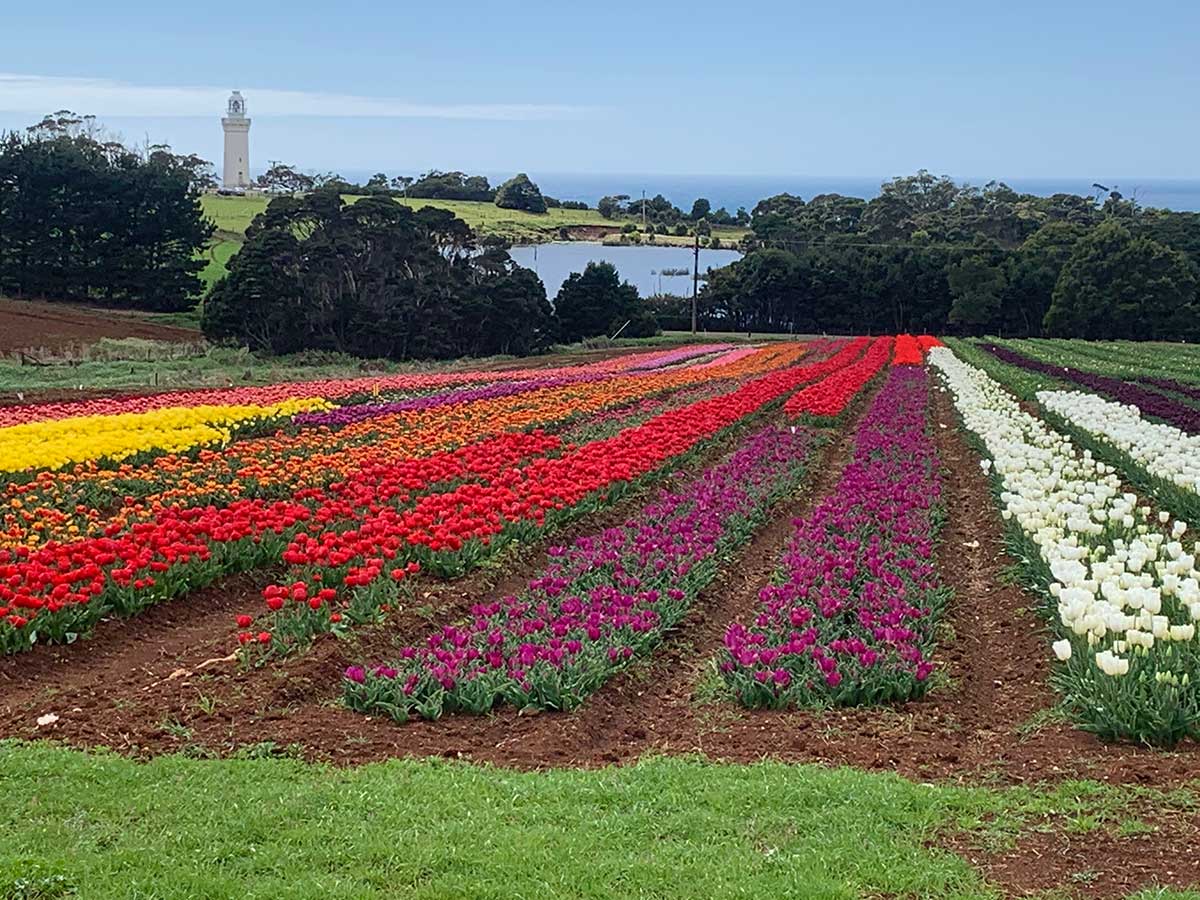 During late September through to mid October the farm explodes with colour. Each year at this time the farm is opened up to visitors to walk in the tulips. Best viewing is normally from end of the first week to the end of the second week in October During the farm's spring open days, visitors can enjoy an impressive indoor display featuring floral arrangements, souvenirs, Devonshire teas, an art gallery, potted tulips, cut flowers and information on growing bulbs. The open days are a lure for photographers who have the opportunity to take fantastic shots utilising backdrops of Bass Strait, the lighthouse and the surrounding rich farmlands to showcase the vista of colourful blooming fields.