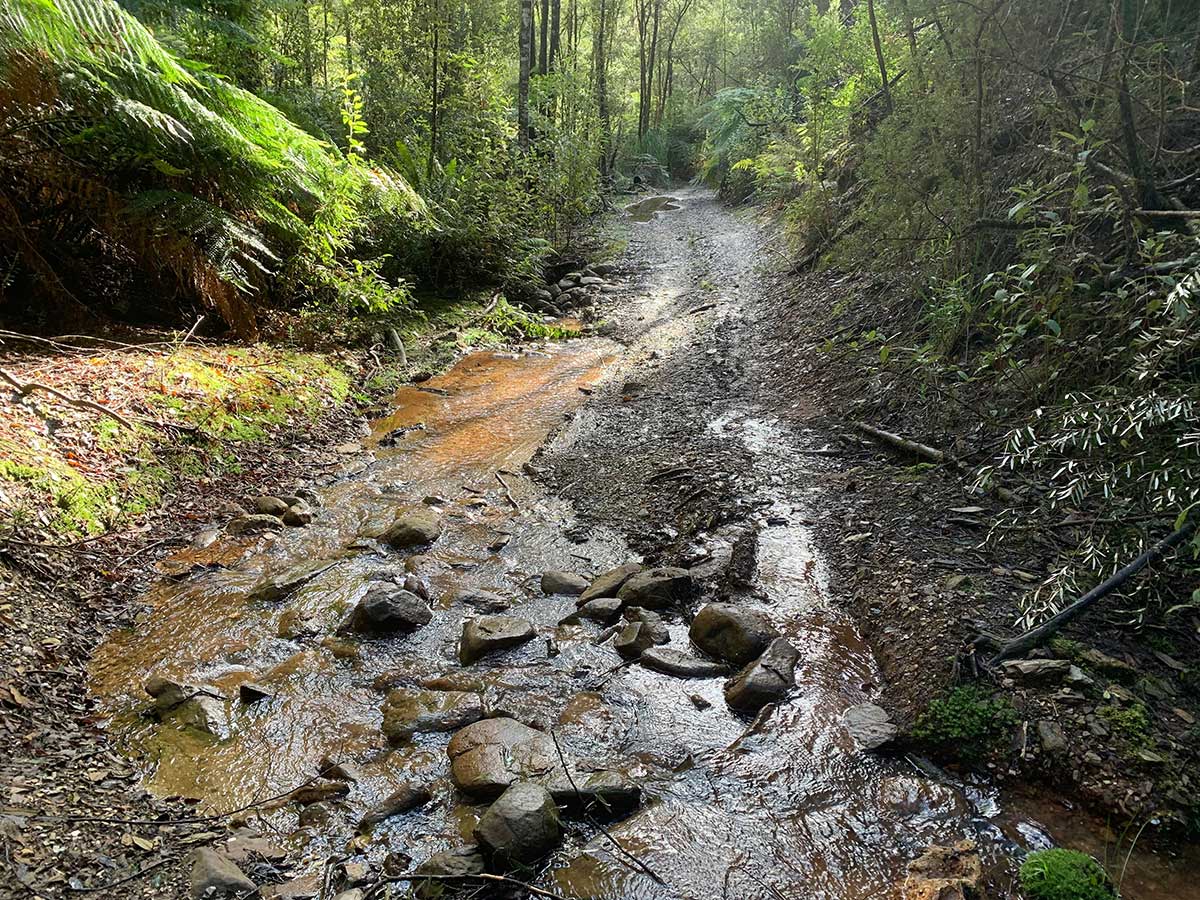 Copper King Road leads down a steep gully to the mine site. The road is a rough downhill track, the mine site is still accessible today but a high clearance vehicle is recommended. Deep ruts across the track make it all but impassable by vehicles. There is very little to show that a mine actually existed here, and employed up to three hundred men at one time, excepting the tell tale signs of tailings, iron precipitate forming at the old shaft entrance and a few metal objects in the creek.