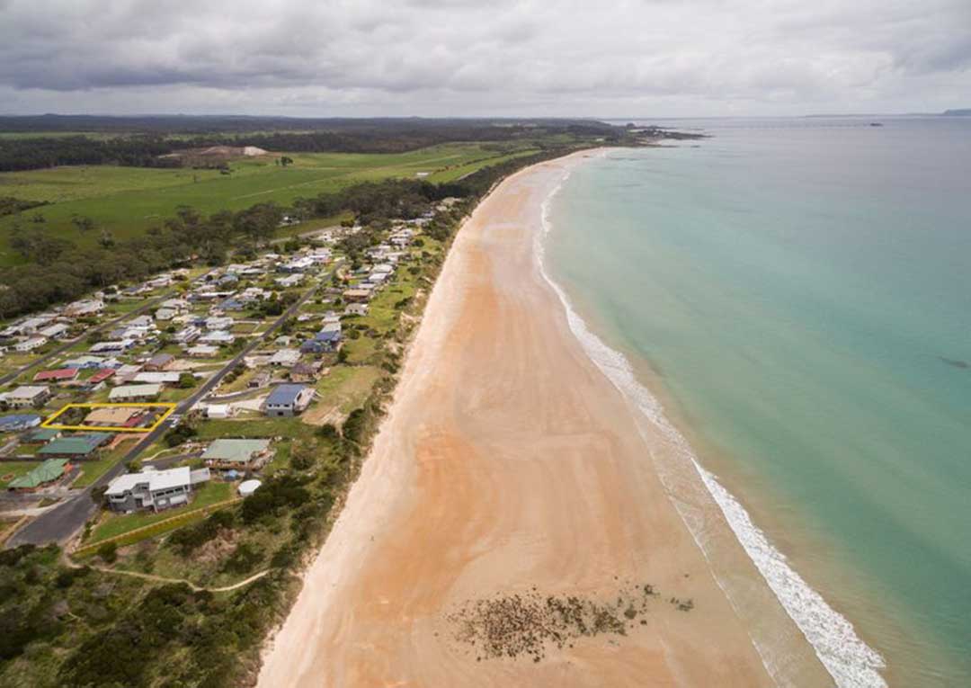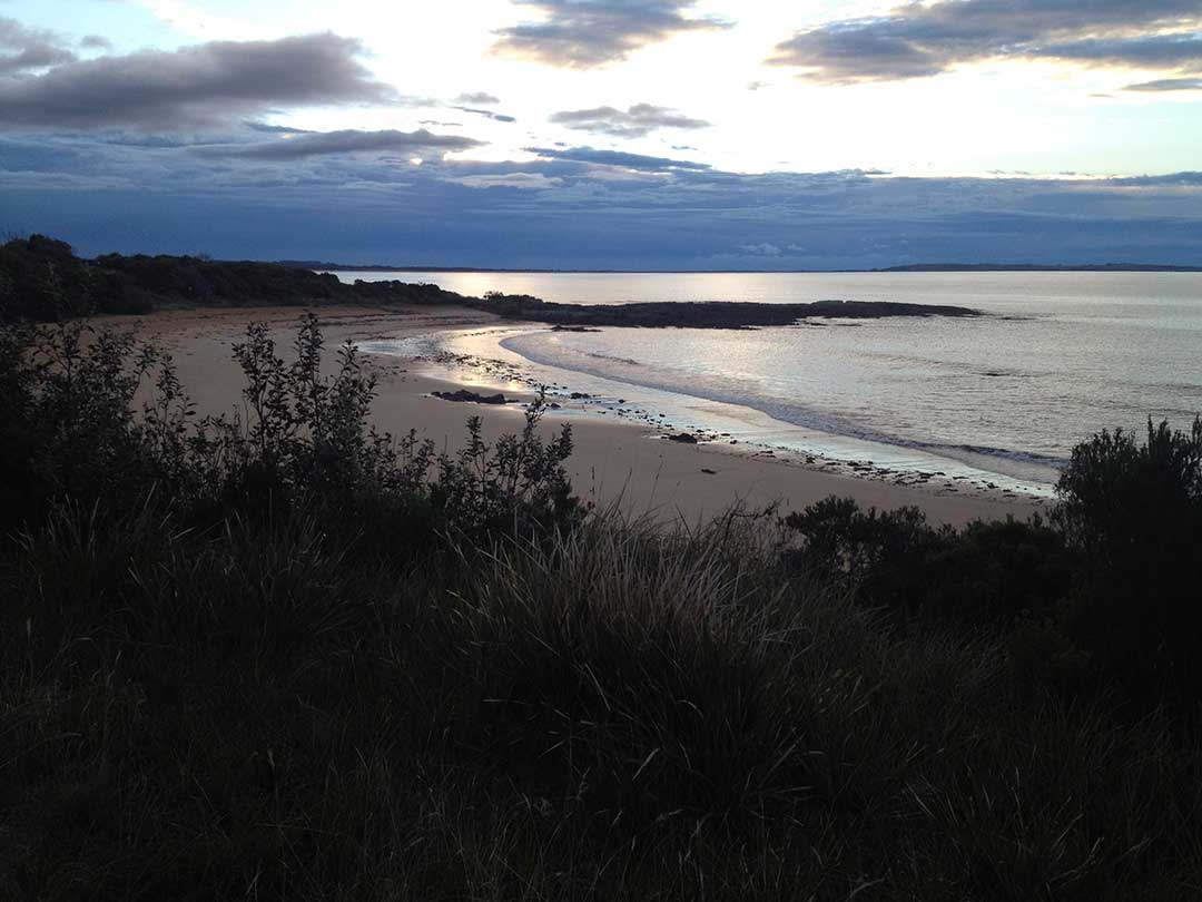 A pretty spot, and a great place to view the sunset over Bass Strait. It has a curving 250 m long north-facing beach bordered by low rocky points. It is backed by a narrow band of scrub, with a car park and small picnic and camping reserve at the western end of the beach and the highway immediately behind the eastern end.