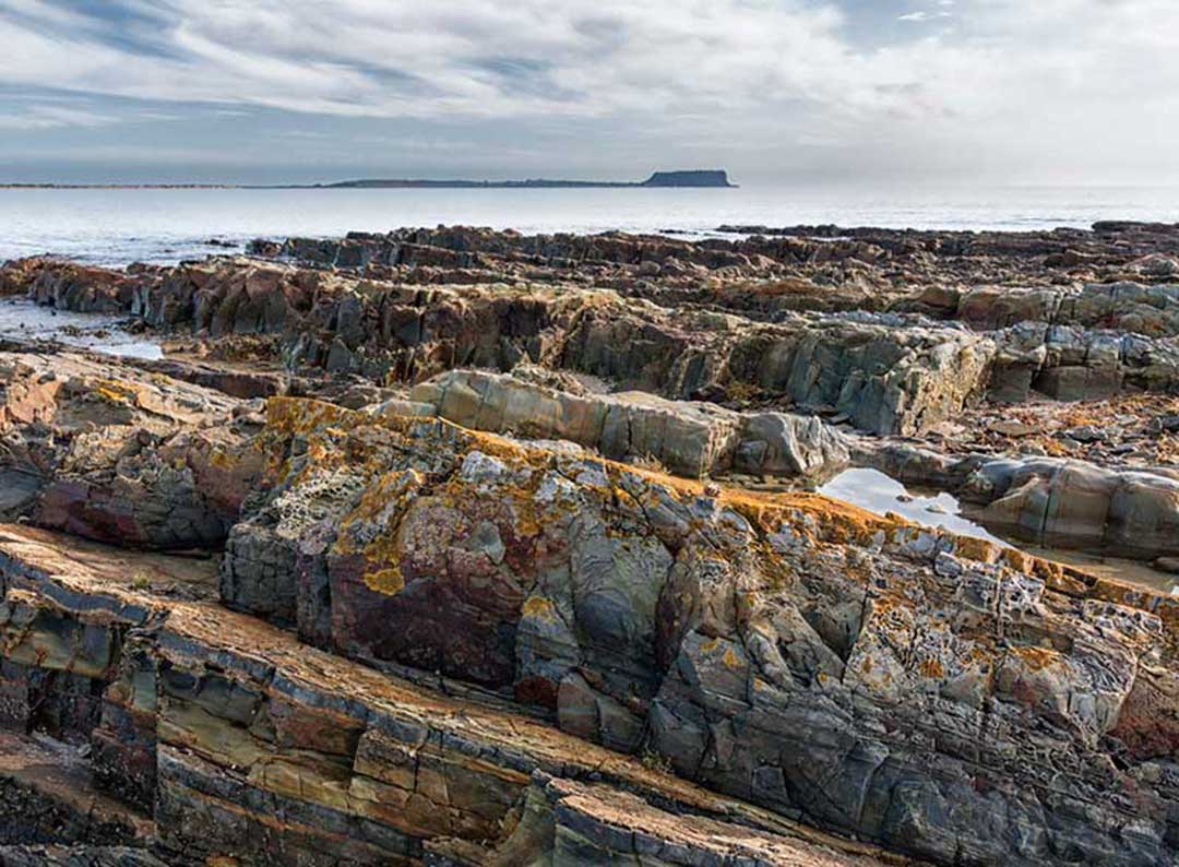Geologically, you'll see fretwork and honey comb weathering of the rocks; hyllite and slate sequences in tilted rocks, highly sculptured with evidence of iron and minerals. The interbedded siltstone and mudstone were deposited between 750 and 1000 million years ago and folded around 510 million years ago. In places these have been intruded by dolerite dykes that might be about 700 million years old. Good shore platform exposure of rocks that underlie much of northwest Tasmania.