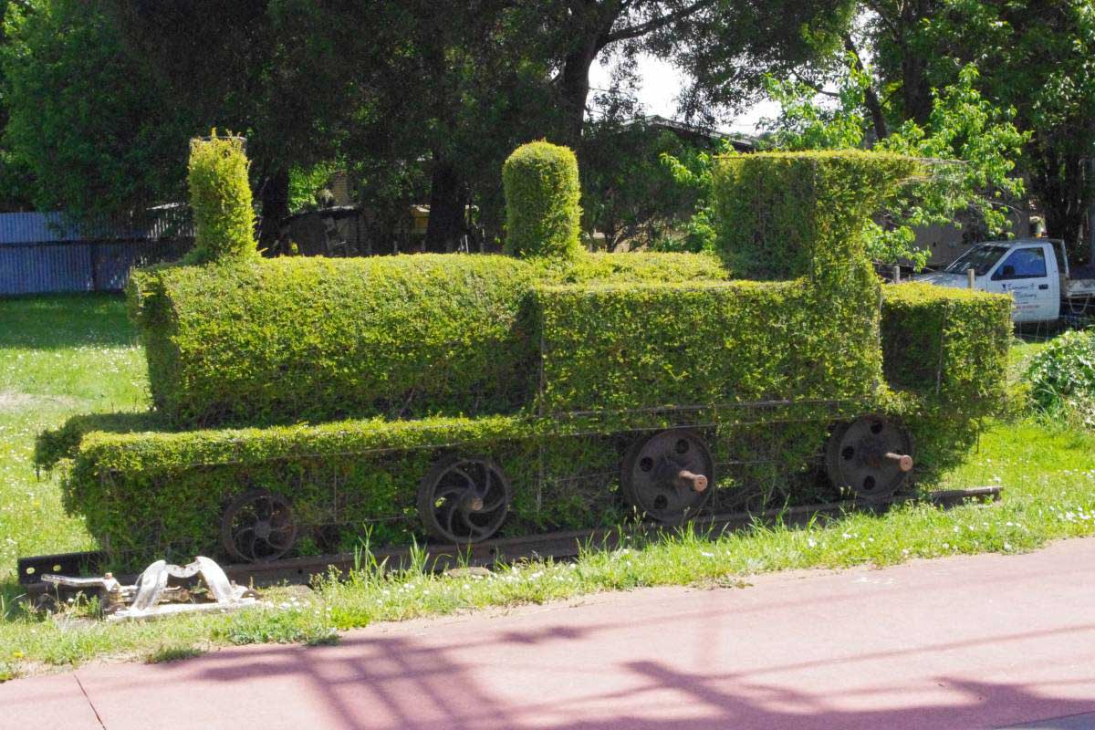 The next topiaries followed shortly after - Ned Kelly - in Dowbiggin Street and Bluey'scrocodile - outside the Railton Motor and Tyre service station. Community support quickly gathered momentum and other businesses and private individuals took up the art. Today there are over 100 individual topiary in the town, many forming their own story or scene, like the topiary service men and women at the cenotaph in town. There is even a park full of topiary animals on Crockers Street.