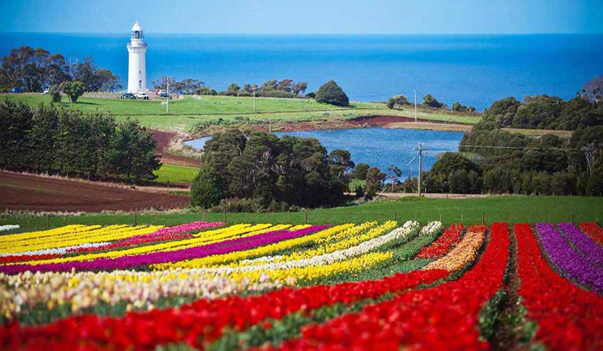 Table Cape - a circular volcanic plug with a flat top - makes an impressive and dramatic backdrop across Bass Strait for the town of Wynyard. Table Cape's top and surrounding areas are composed of fertile basalt soils and are heavily cultivated, the area is renowned for the annual flowering of tulips during spring and accompanying tulip festival.