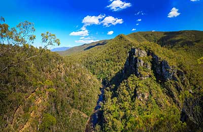 Leven Canyon is a 250 metre deep ravine that is part of a wildlife corridor from the coast to Cradle Mountain. The Leven River runs through 300-metre limestone cliffs carved through the Loongana Range, down to Bass Strait. The canyon is a little-known tourist destination, however the viewing platform offers spectacular views of Black Bluff, the canyon itself and the surrounding areas. A walking track gives access to the canyon floor.
