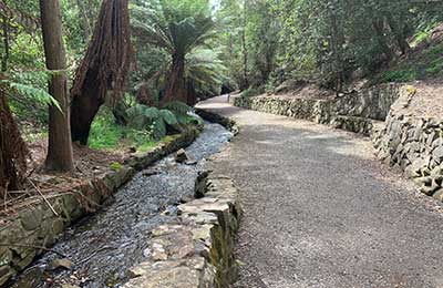 A pleasant walk through the manicured gardens and lawns of Burnie Park, then up a walking trail through a strip of remnant forest to Oldaker Falls.
