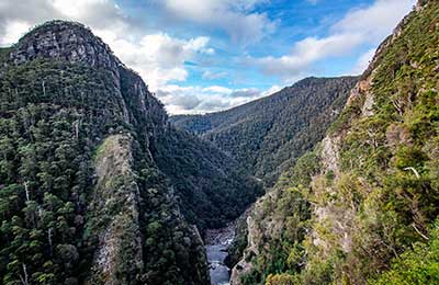 A delightful wayside stop on the Murchison Highway, the steep, winding gorge of the Hellyer River is filled with rainforest of tall myrtle beech, encrusted with mosses, fungi and epiphyte orchids. A number of walking tracks along the banks of the Hellyer River (near the rest area) provide a pleasant walk to refresh before journeying on.