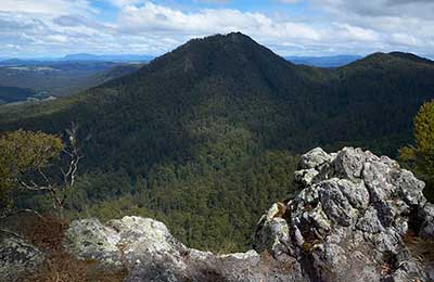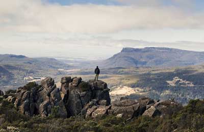 A walk to the sandstone rock visible near the top of the Great Western Tiers, looking south from Mole Creek village. Shorter walks access signposted landmarks along the Track.