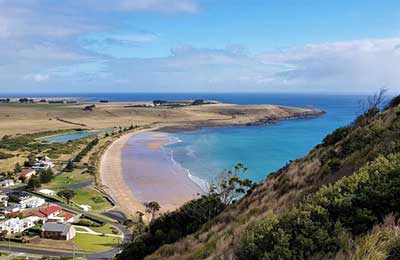This may well be the most beautiful village and beach on the whole north coast of Tasmania. It tumbles down the side of a gentle hill to a superb white beach with rocky headlands on either side.