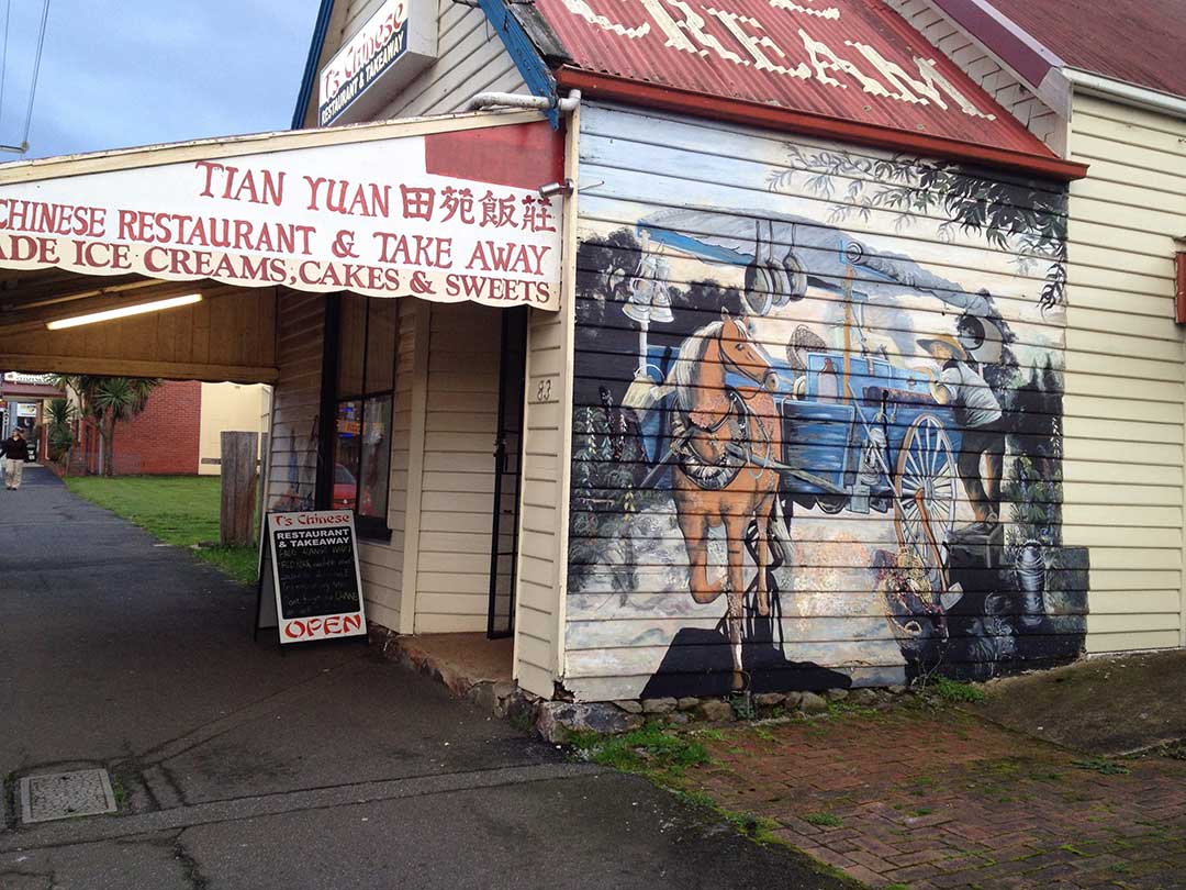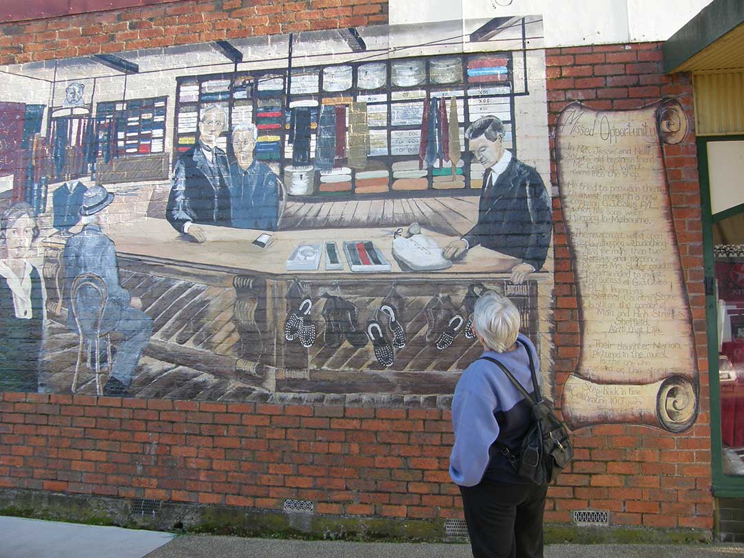 The murals provide genuinely fascinating insights into the local community, its history and culture. A near-perfect example is the mural, The Missed Opportunity (above). Painted by Cheyne Purdue in 1990 and located on High Street it depicts a moment in the town's history when "In 1926 Jesse and Nellie Slater's old business friend, Mr Coles of nearby Wilmot, came into the shop. He tried to persuade them to invest money in a new company, G.J. Coles P/L, which his sons were forming in Melbourne. The new concept was of open display shopping, with nothing selling for more than 2 shillings and sixpence. Mr & Mrs Slater couldn't be persuaded to invest. The success of G.J. Coles P/L is legendary ... Slater's Country Store is still on the corner of Main and High Streets."