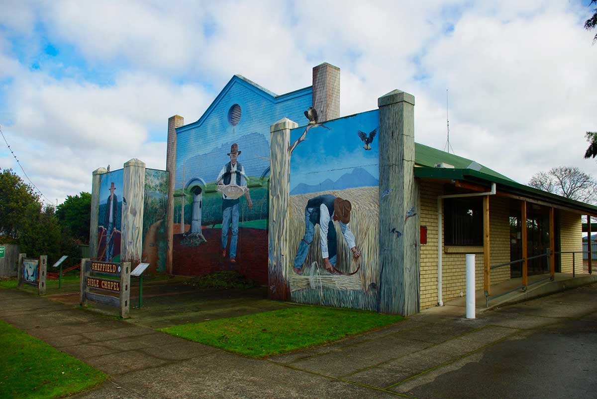 Sheffield’s mural-covered Bible Chapel has a long history and it is associated with the early Christian Brethren. The Christian Brethren, also known as the Plymouth Brethren, originated in Great Britain in the 1820s. By the mid 19th century the movement had spread to Australia, with the first revival meetings held in Tasmania from 1869. The first Gospel Hall was established by the Plymouth Brethren in the 1870’s and was situated about 2 kilometres outside of Sheffield on the Kentish Road. It was replaced by a current Gospel Hall in January 1926.