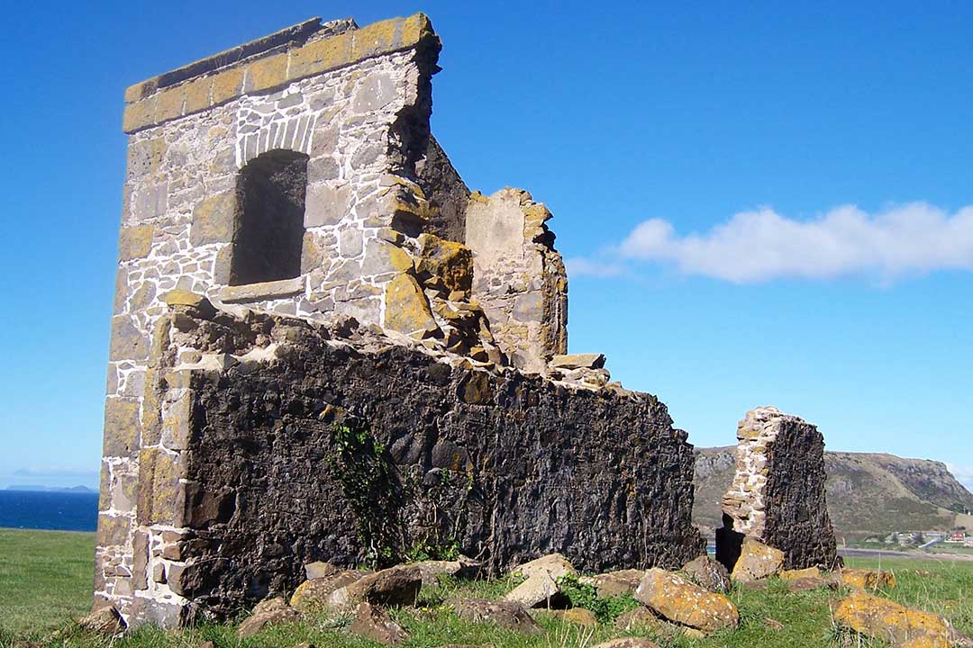 At the top of the hill is the bullyard and the ruins of Barracks for the assigned servants, with walls of fieldstone and large bluestone blocks at the corners. The barracks were built in 1834 and occupied from 1836. There were 41 convicts assigned to the Circular Head establishment, half of whom were housed in these barracks.