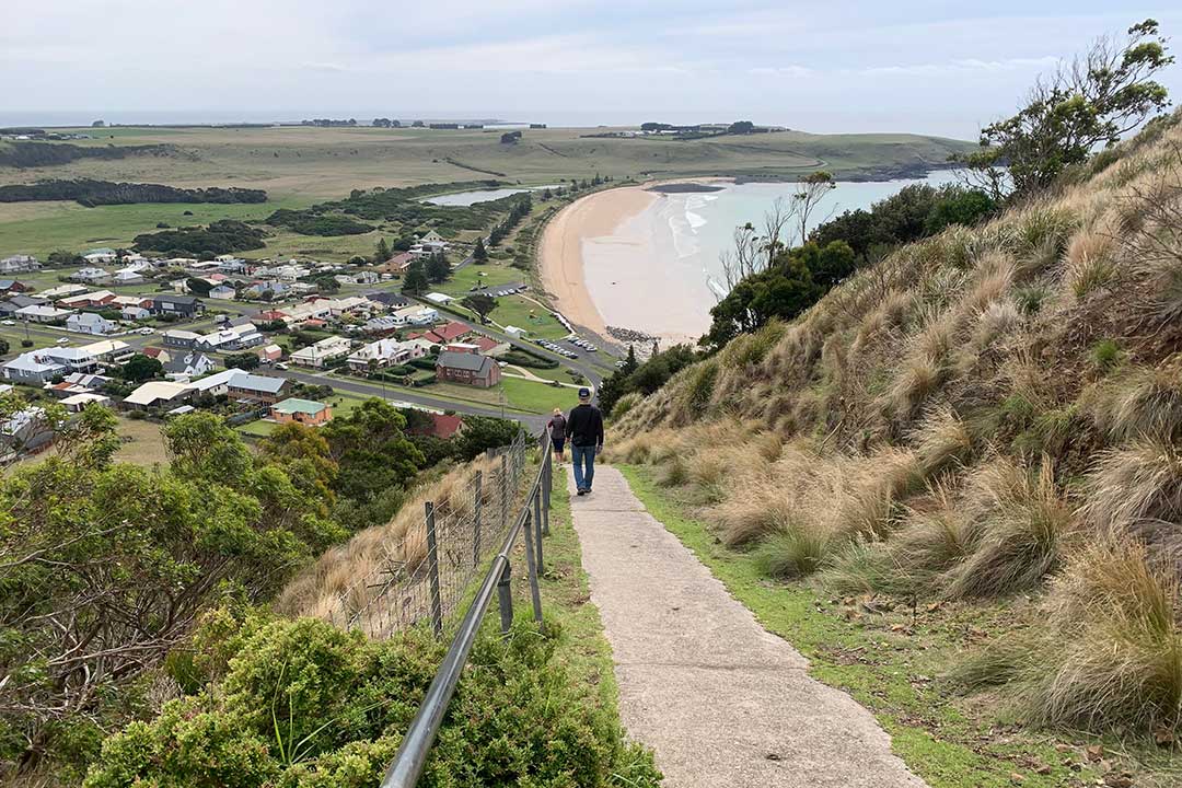 The Nut is an extraodinary geological feature looming above the village of Stanley and can be seen from a great distance. At the top there are excellent views over the town and Bass Strait. There is a diversified circular walk around the top of the Nut with a number of well formed viewing platforms. Most of the walk is through windy grasslands with several lookouts, but one section is through a small forest and has an enchanted feel. The track is nearly 2 kilometres long. There is a sheltered gully which provides welcome relief from the strong wind that often blows across the top