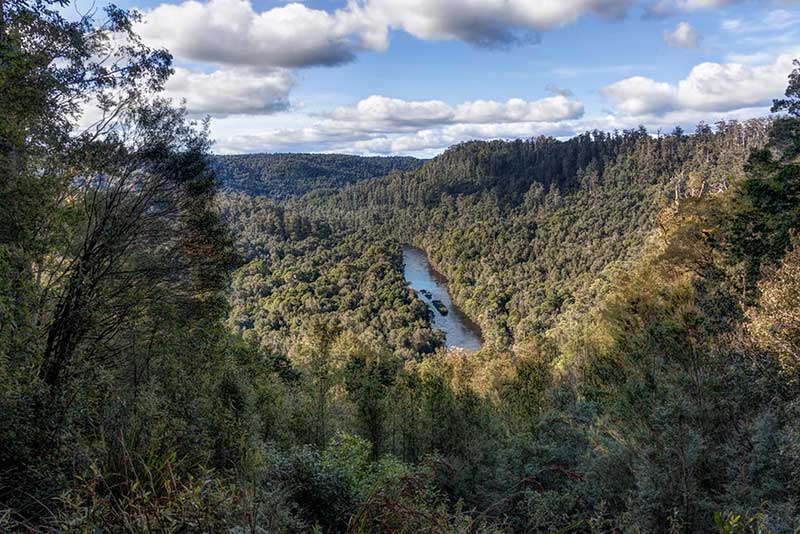Along the way is Sumac Lookout, that has expansive views over the Arthur River and forests. Just after the Kanunnah Bridge, a dirt road climbs to the lookout. You'll be greeted by a large carpark and a massive wooden sign to let you know you've arrived. The lookout features a sturdy wooden rail and the trees are cut back to give you uninterrupted views of the valley and river below.