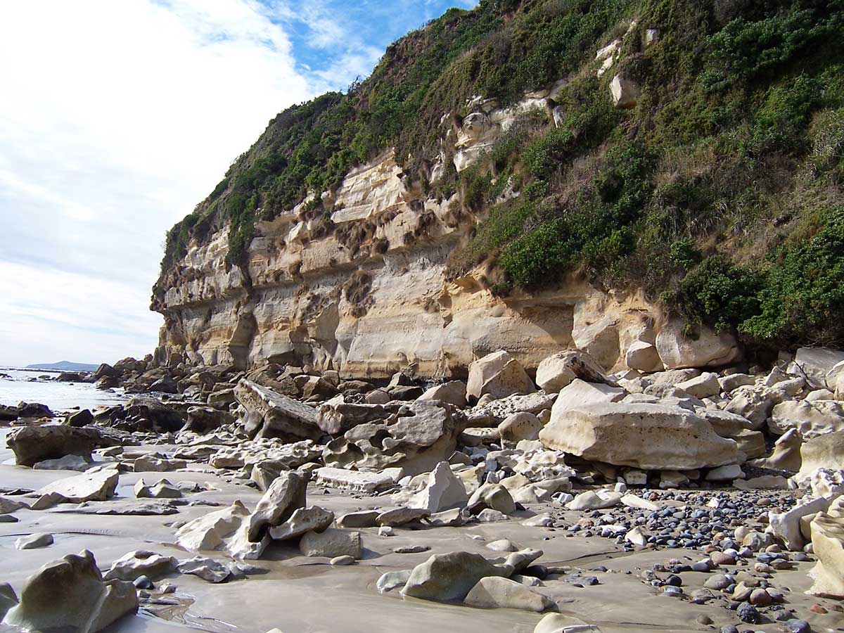 Near high water mark close to the cliff face of Fossil Bluff there are many blocks of very fossiliferous sandstone or siltstone, which have fallen from the cliffs above. The cliffs contain a succession of light coloured rocks, scarcely consolidated sands and limey silts which were deposited on a beach and in a shallow bay some 22 million years ago. Please note that collecting is not permitted in the Conservation Area.
