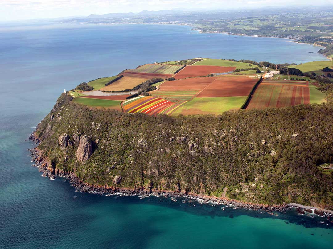 The flowers everyone comes to see here are the tulips grown on the farm of Van Diemen Quality Bulbs. It is in fact the largest tulip fields in the Southern Hemisphere that you can actually wander in, but though the farm operates all year round, it is only during late September through to mid October that it explodes with colour. Visitors are welcome to see this spectacle and delight at walking amongst the tulips. It is also a lure for photographers who have the opportunity to take fantastic shots utilising backdrops of Bass Strait, the lighthouse and the surrounding rich farmlands to showcase the vista of colourful blooming fields.