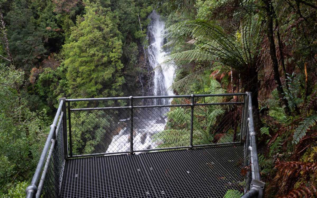 Previously closed to the public, the track has been upgraded and leads to a viewing platform near the falls. Good fitness is required as the downhill gravel walk takes 40 minutes each way and descends 240 timber steps. Well worth the effort, it is well signposted from the turnoff at the road and impossible to become lost.