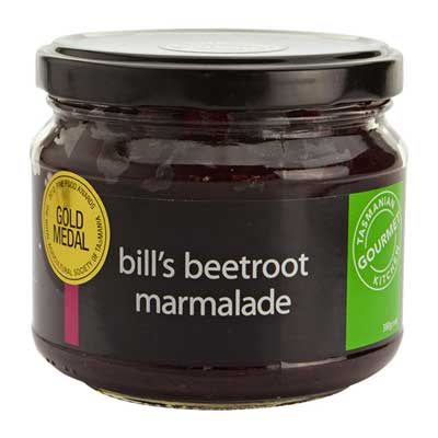 For most Aussies their only contact with beetroot is when it falls out of a hamburger and stains their clothes. Beetroot is in fact one of the healthiest vegies around, and has been used since Romans times as everything from an aphrodisiac to a source of fibre and potassium and as a detoxing agent. The Bill after whom this home-made marmalade is named works late into the night peeling and chopping the beetroot that goes into this distinctively different, yummy and extremely versatile product that goes on just about everything.